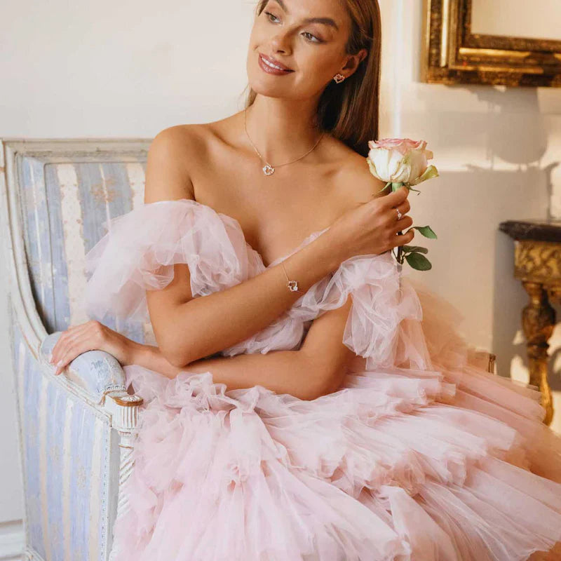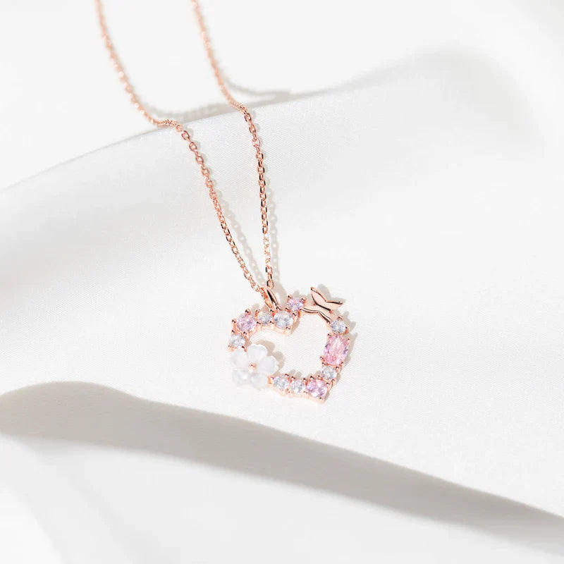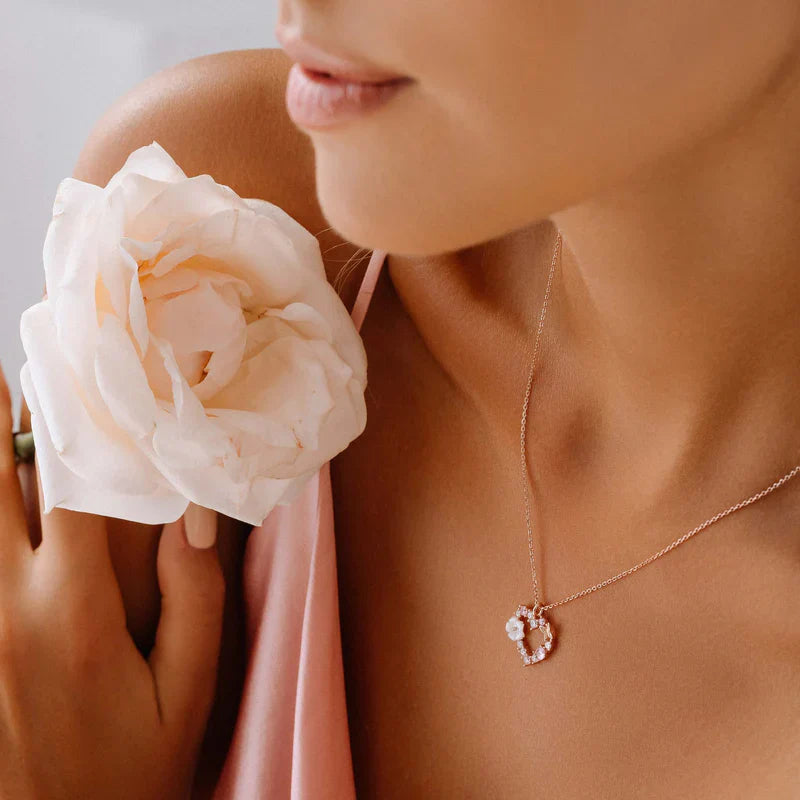 - Materiał: wysokiej jakości srebro próby 925, powłoka z prawdziwego różowego złota, cyrkonia (imitacja diamentu), kwiat z masy perłowej